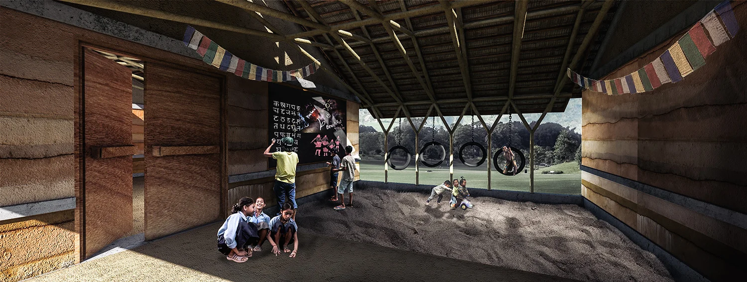 The play space component is an integral part of the design and it will challenge the typical design of classrooms all over Nepal. This multi-functional space can be conceived for many functions such as an covered play space, an art center, a small theater and a communal space. Moreover, having a covered play space will allow the students to move and play around regardless of the weather conditions